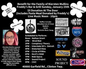 $5 donation gets you in, includes a pasta meal (donated by Freddy’s), kids under 12 are free. Famous Mac Marys on special $8 & pickle shots $6 – a portion of the sales will be donated to the family. TONS Of raffles: lots of baskets, Wheelbarrow of Cheer, Rock Box full of merch from your favorite local bands, and 50/50 running all day!
